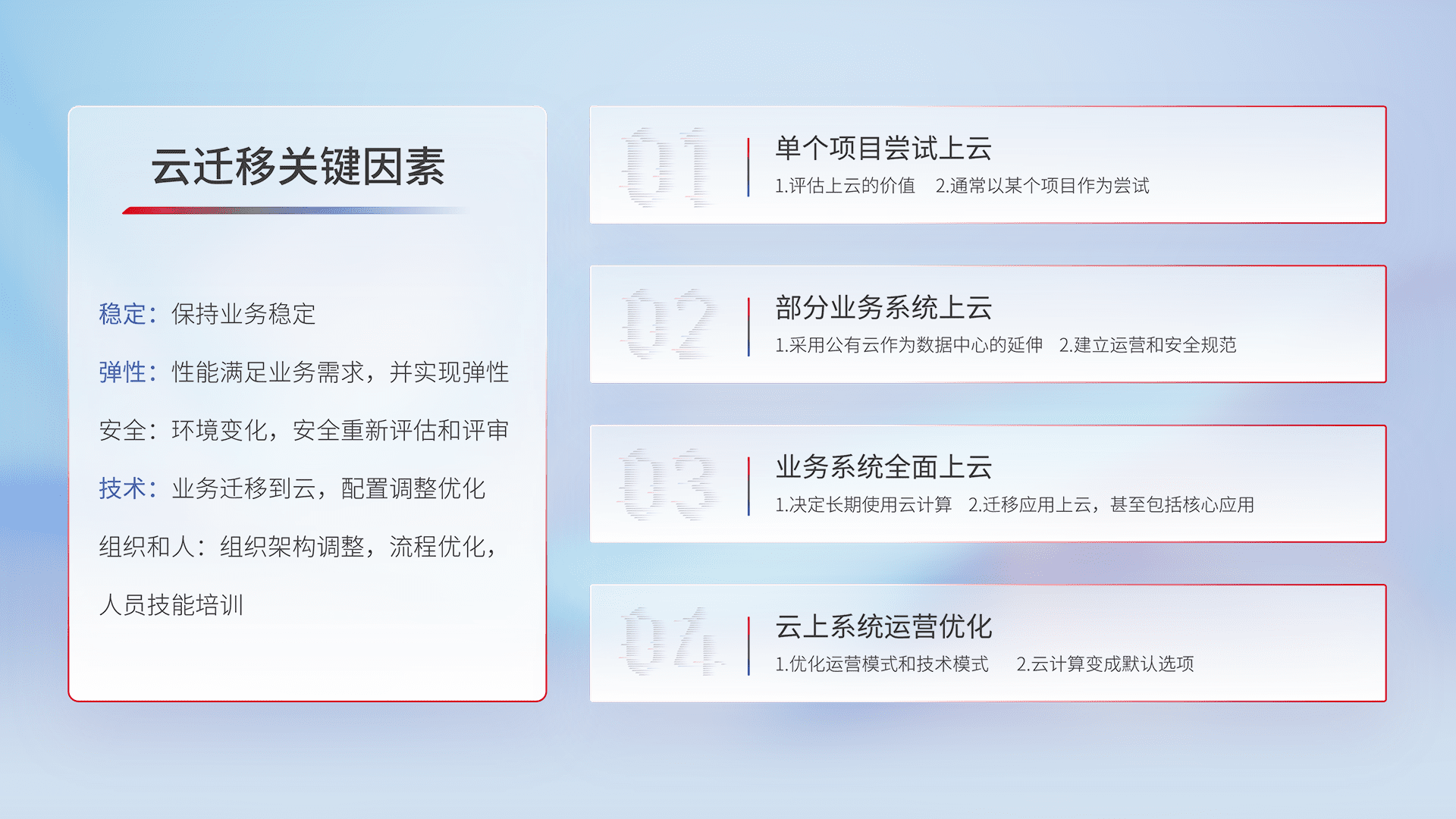 结合实际业务,,,,从规划设计、、云平台选型、、云原生改造、、、、数据迁移、、、、集成交付,,,,迁移全过程为客户识别最佳上云路径,,做好风险识别管理,,,设计网络架构、、、身份权限、、、安全审计合规、、、操作审计、、日志审计、、、、监控告警策略、、、多站点容灾设计等,,,对云上基础设施进行整体规划,,,,提升IT治理水平,,以满足弹性、、高可用、、高性能的需求。。。。