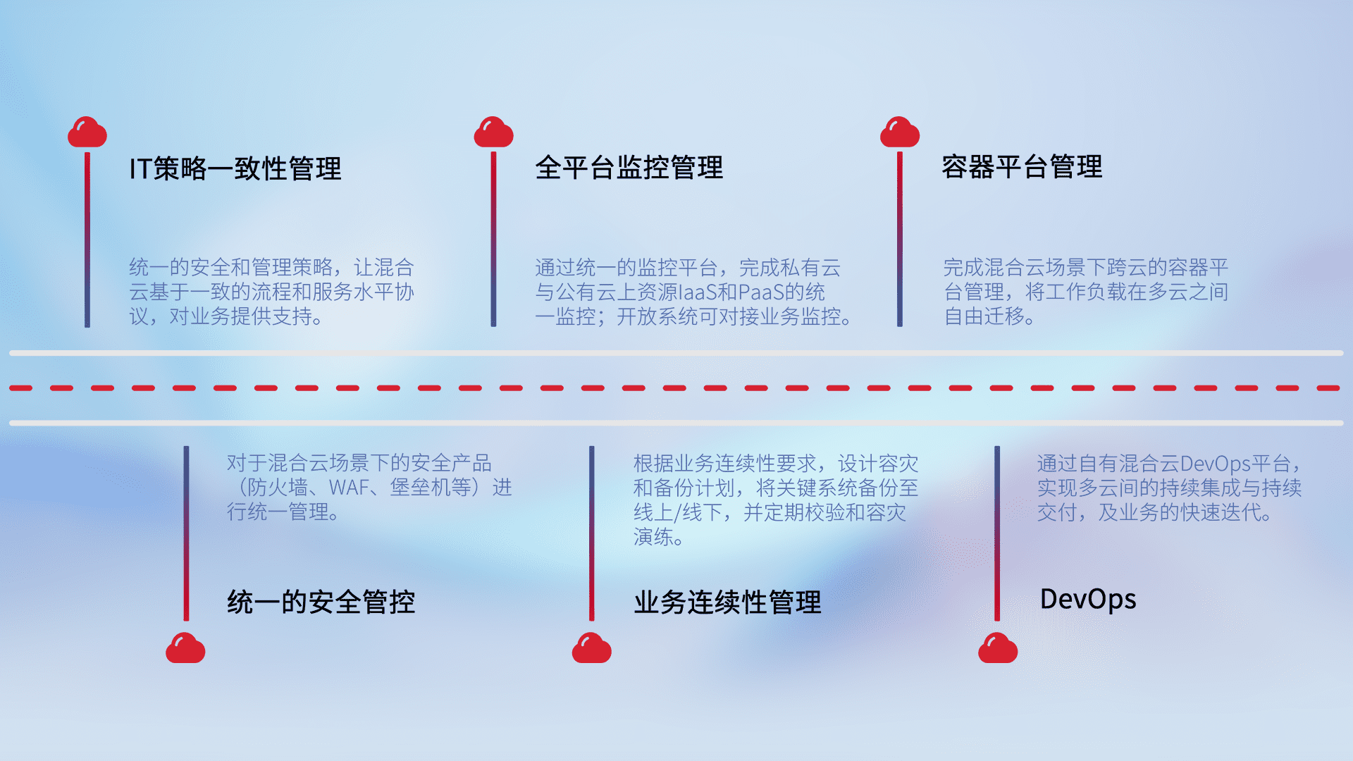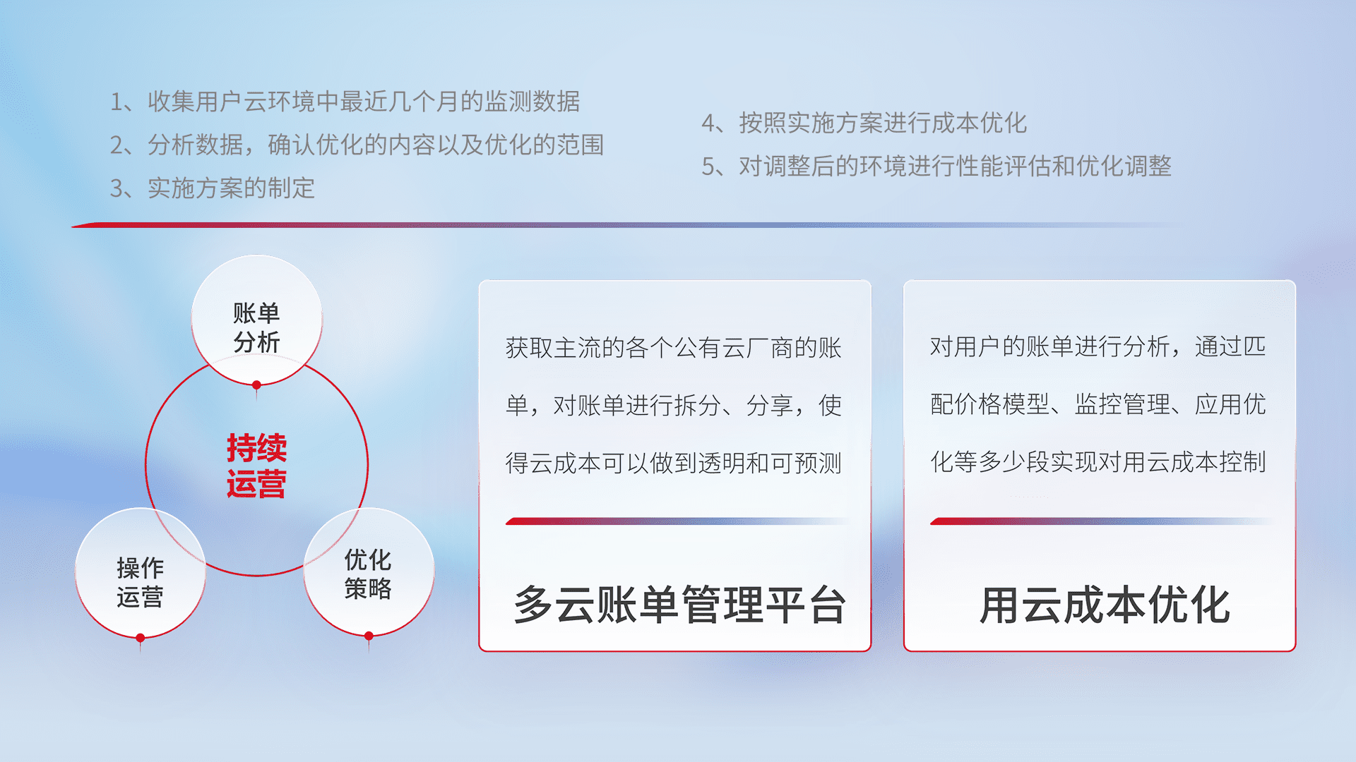 通过多云纳管,,,,以统一的资源数据模型把客户的云资源进行抽象和封装,,,进而实现对多云资源的统一操作,,,保障云资源管理的可靠性、、稳定性与可用性。。。。量身定制化运维内容,,,配置、、、、开发运维、、补丁管理、、备份、、、、监控、、、、认证和访问管理、、、审计和日常巡检等,,保障在用云过程中的可靠度,,稳定度以及高可用率。。。