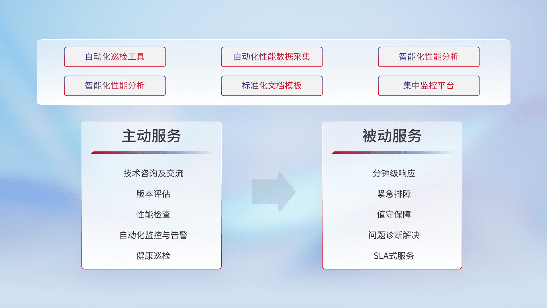 智能化工具和标准化文档,,,,保障服务质量,,,,提供主动服务(包含技术咨询、、、版本评估、、性能检查、、、、自动化监控与告警、、、、健康巡检)和被动服务包含(分钟级响应、、、、紧急排障、、值守保障、、问题诊断解决、、SLA服务)。。。。